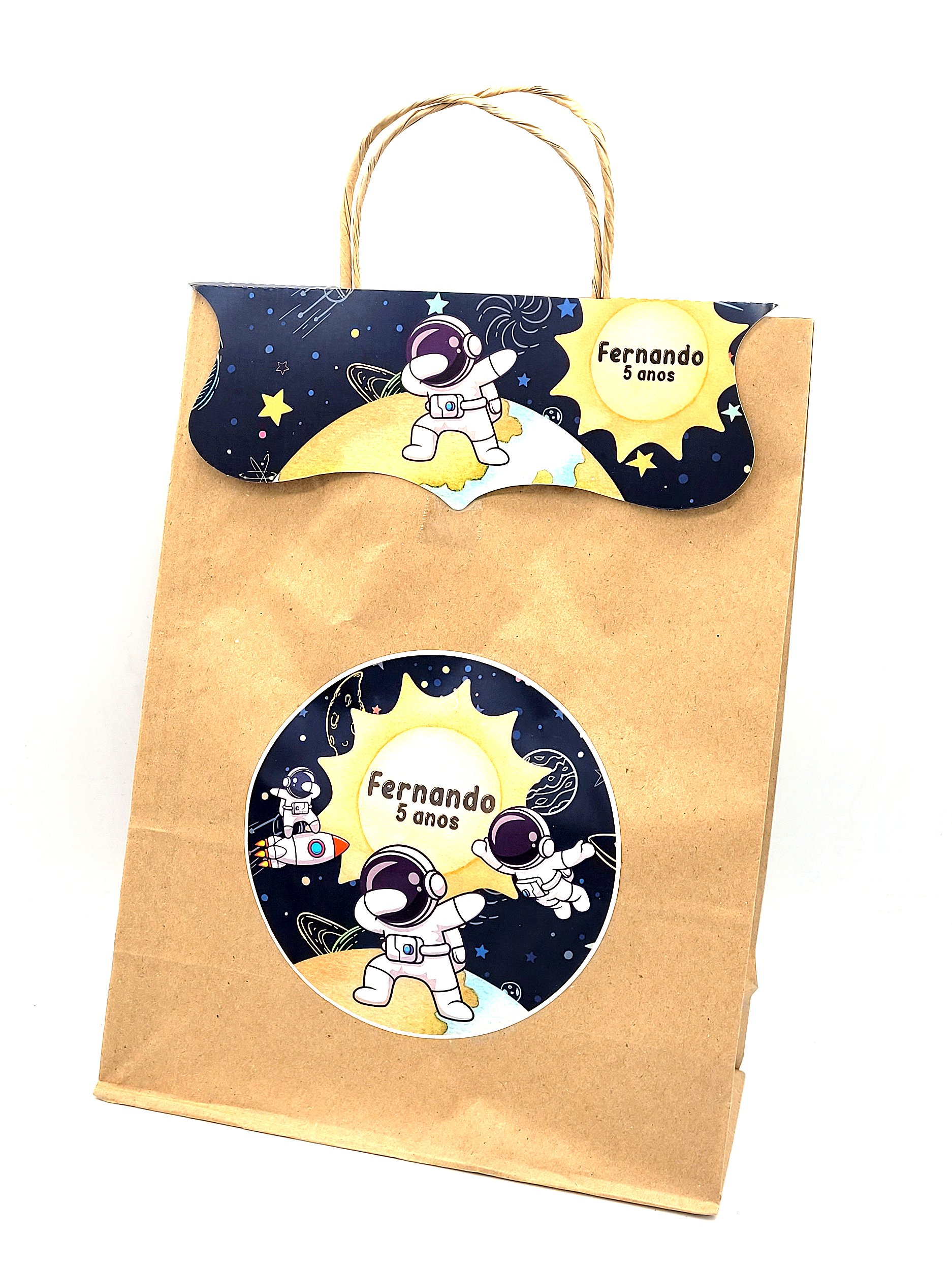 Sacolinha de papel kraft, com aba de papel e adesivo personalizado.